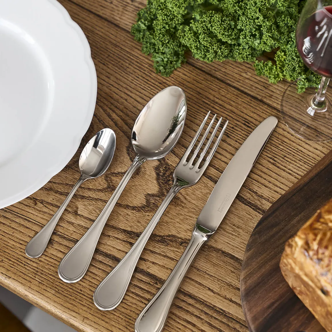 La collection de couverts VERLAINE ARGENTÉ de DEGRENNE est une référence classique et intemporelle qui reflète une élégance discrète et perpétue la tradition des arts de la table à la française. La collection est disponible dans un assortiment large et les couteaux de table existent en version manche orfèvre ou monobloc, lame unie ou lame scie. Réalisée en acier 18-10, de haute qualité et résistance, ces couverts sont argentés en classe I et garantis par le poinçon carré d’orfèvre. La main de l’homme occupe une place centrale dans nos ateliers d’argenture de manière à offrir une qualité irréprochable.