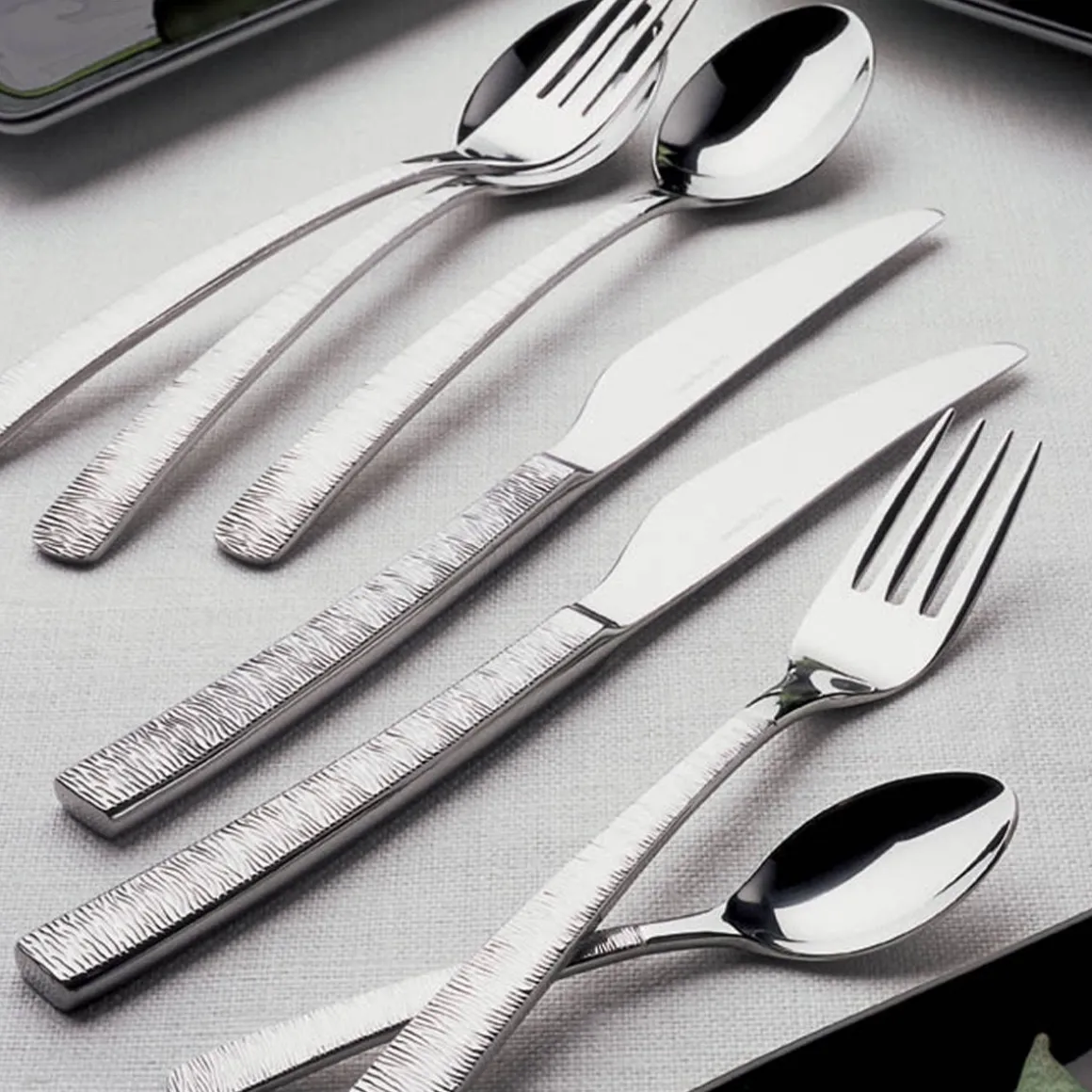 Avec ses formes élancées et son manche délicatement ciselé, la collection ASTRÉE CISELÉ joue avec la lumière pour habiller les tables avec originalité et raffinement. Sa finition texturée idéale pour un usage au quotidien s’associe avec brio à différents styles de vaisselle.