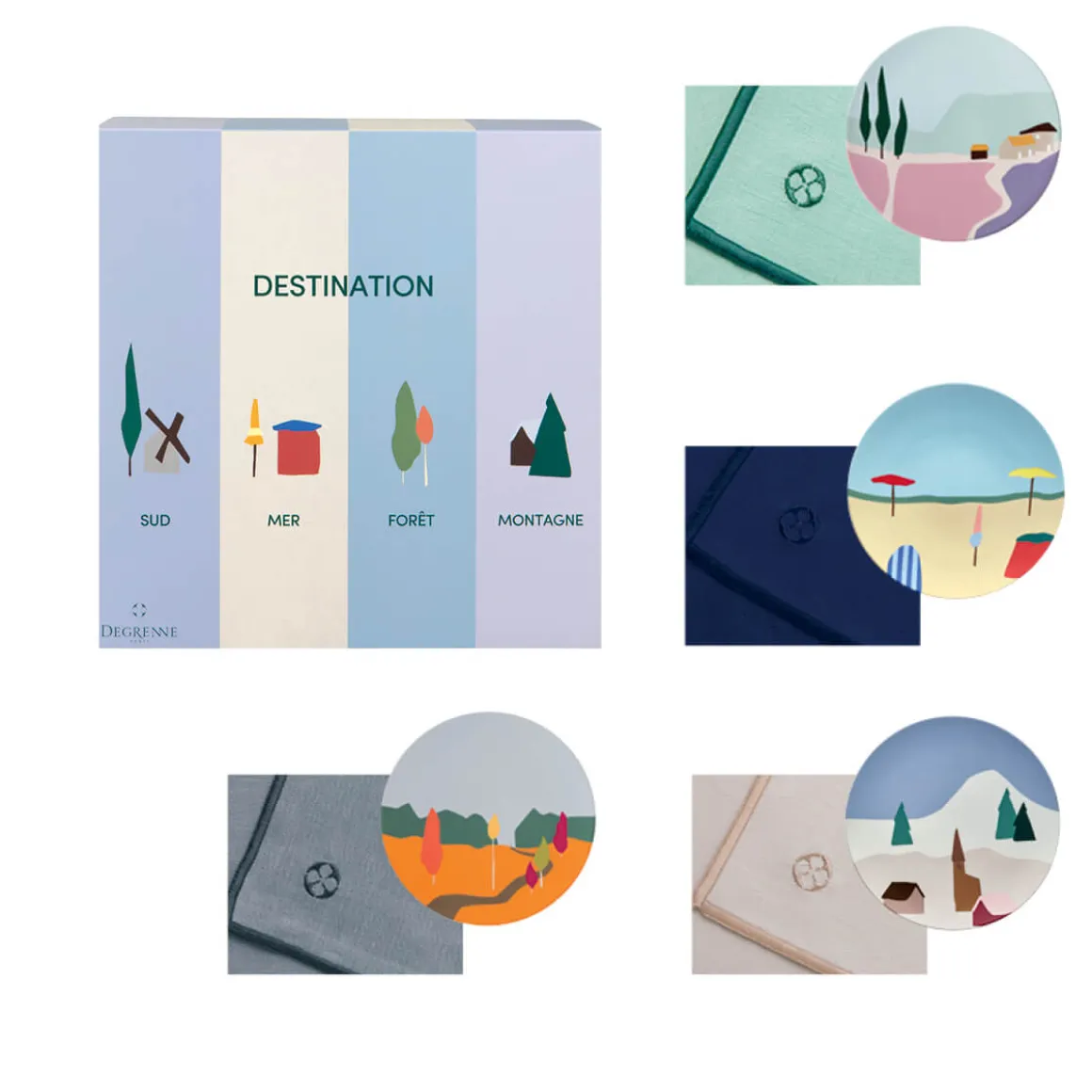 La collection DESTINATION s’agrandit avec deux coffrets regroupant les quatre voyages : SUD, MER, FORET et MONTAGNE. Le premier coffret est composé de quatre assiettes et quatre serviettes, chaque assiette étant issue d’une DESTINATION différente et associée en couleur à une serviette coton-lin de la collection NUANCES. Le second coffret, lui est composé de quatre mugs constitué également de chaque DESTINATION. Ces coffrets seront de parfaits cadeaux pour tous ceux qui souhaitent redécouvrir nos belles régions françaises au gré des envies et des saisons.