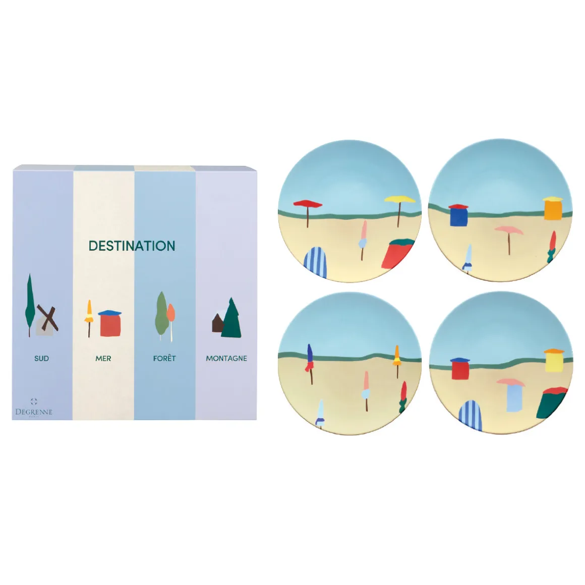 La Maison DEGRENNE crée une collection de vaisselle inspirée par les plus beaux paysages français. Pour sa première destination, DEGRENNE s’inspire du bord de mer et des plages mythiques de sa région natale, la Normandie. Une collection aux couleurs synonymes de vacances, de détente, de plaisir et de partage. Le décor façon papier découpé apporte légèreté et modernité à ces paysages de bord de mer. La collection se décline sur plusieurs formats pour des instants de partage salés ou sucrés. DESTINATION MER apportera de la gaieté et un petit air de vacances sur vos tables.