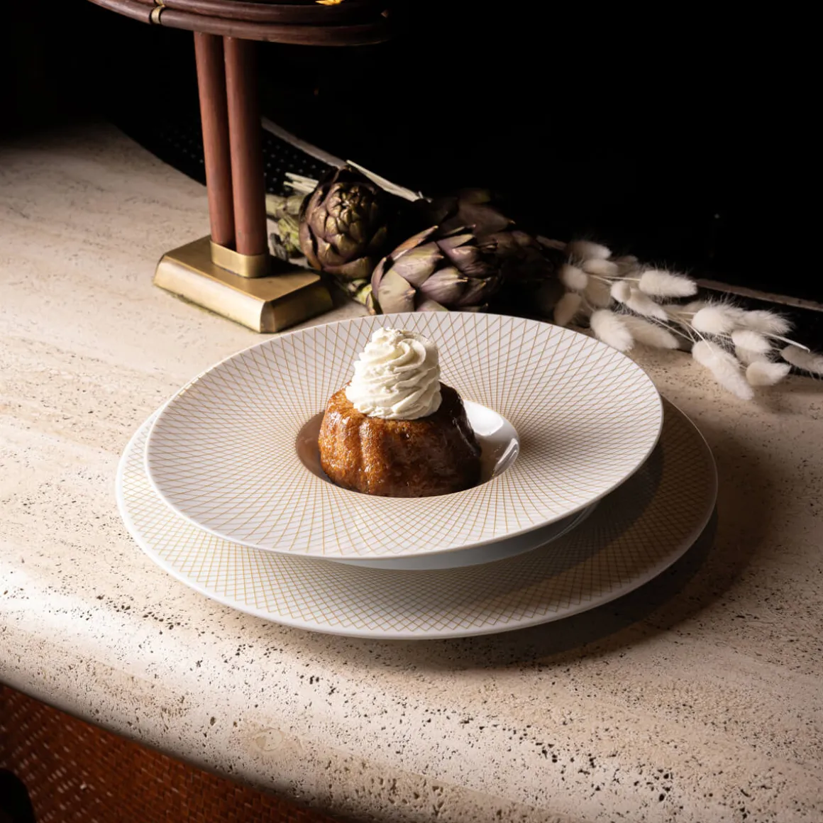 La collection GRAPHIQUE CLASSIQUE DORE présente un décor de maillage doré en relief sur une base de porcelaine à aile. Ce motif texturé est obtenu grâce à un savoir-faire unique de la Maison DEGRENNE. Chaque décor est posé à la main par nos artisans dans notre manufacture. La collection GRAPHIQUE CLASSIQUE DORE propose un motif original, élégant et intemporel dans une diversité de tailles et de formats. Elle saura sublimer vos moments, vos tables et vos plats de touches dorées et blanches.