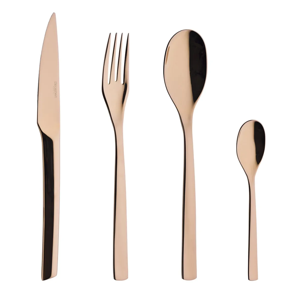 La collection de couverts GUEST CUIVRE de DEGRENNE offre un registre de forme à la fois contemporain et consensuel. Sa finition cuivrée habille les tables dans un esprit original et raffiné. Réalisés en acier inoxydable 18-10, de haute qualité et résistance, les couverts sont revêtus d’une finition PVD cuivre (dépôt physique par phase vapeur) à longue tenue dans le temps. Le coffret 24 pièces GUEST CUIVRE contient 6 fourchettes de table, 6 couteaux de table, 6 cuillère de table et 6 cuillères à café.