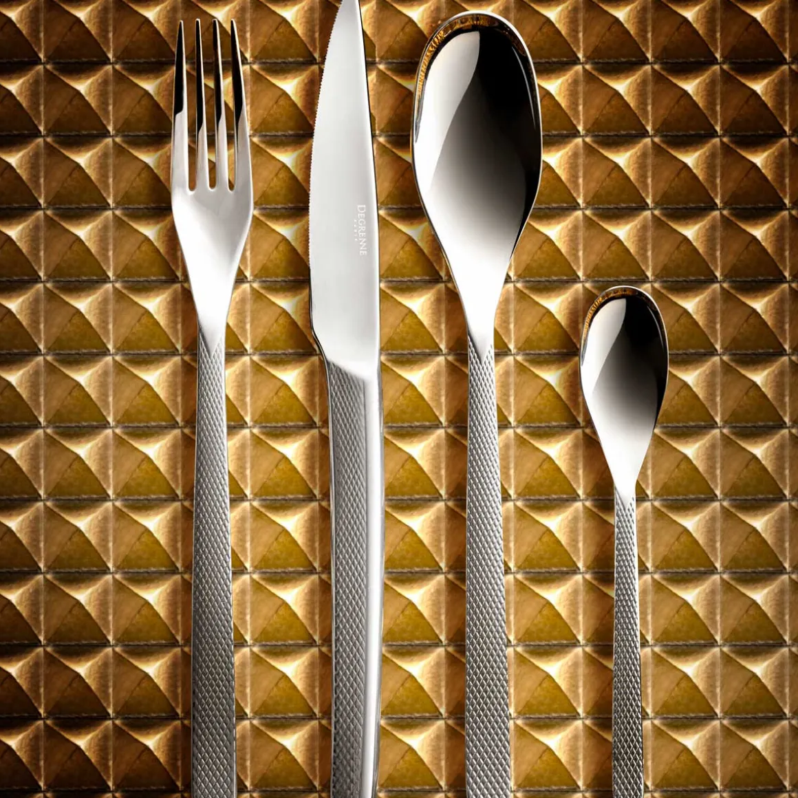 Les couverts GUEST STAR de DEGRENNE allient précision du design avec des lignes pures et modernes, et séduction avec une personnalité unique. Leurs manches sont habillés d’un décor finement gravé, inspiré d’une ciselure de taille diamant. Ce relief joue avec la lumière et fait scintiller le couvert pour le mettre en éclat sur la table. Réalisés dans un acier inoxydable 18-10 de la plus haute qualité, ces couverts présentent une résistance exceptionnelle et sont d’un entretien très facile.