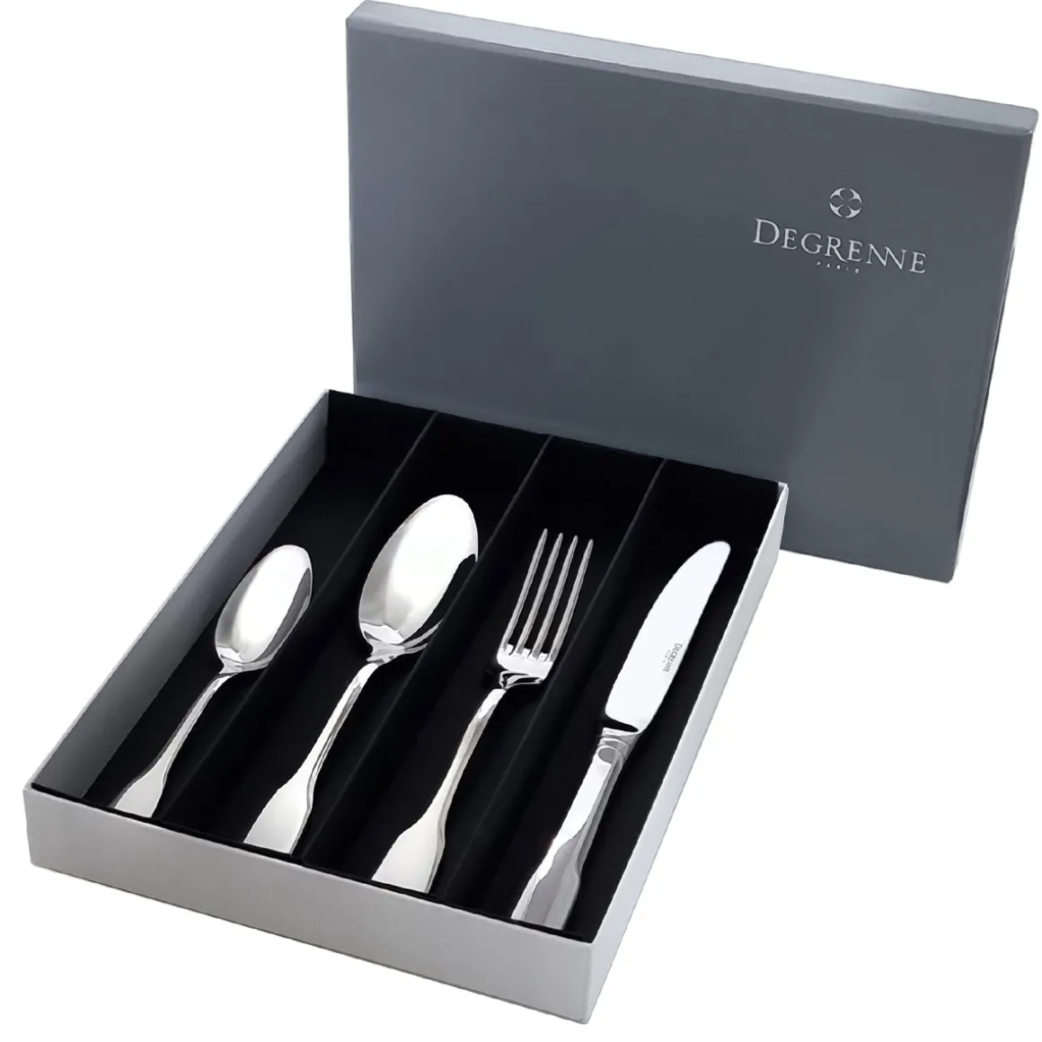Les couverts du coffret enfant LUTECE grâce au style classique et intemporel de la forme violon associé à une finition orfèvre sont un symbole de l’élégance à la française. Ils sont parfaitement adaptés aux besoins des enfants. Le design et l’innovation, le soin apporté aux finitions et une très grande qualité de fabrication caractérisent la collection de couverts Degrenne. Le coffret est déconseillé aux enfants de moins de 3 ans.