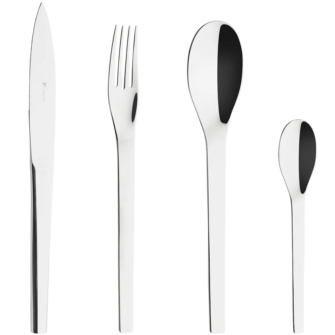 La collection de couverts MIRAGE de DEGRENNE offre un registre de forme moderne et épuré. Le design rectiligne et minimaliste met l’accent sur l’originalité des couteaux, disponibles en deux versions. La forme innovante des couteaux n°1 permet de garder une face totalement lisse, sans aucune aspérité visuelle, pour des tables originales au caractère unique. Les proportions modernes des couteaux n°2 sont plus consensuelles sans perdre leur design minimaliste particulier. En acier inoxydable 18-10, de haute qualité et résistance, ils sont faciles d’entretien. Le colis-écrin 100 pièces est constituée de 12 fourchettes de table, 12 cuillères de table, 12 couteaux de table, 12 cuillères à café, 12 fourchettes à gâteaux, 12 fourchettes à dessert, 12 couteaux à dessert, 12 cuillères à dessert, 1 cuillère de service, 1 fourchette de service, 1 pelle a tarte et 1 louche dans un coffre de rangement 3 tiroirs.