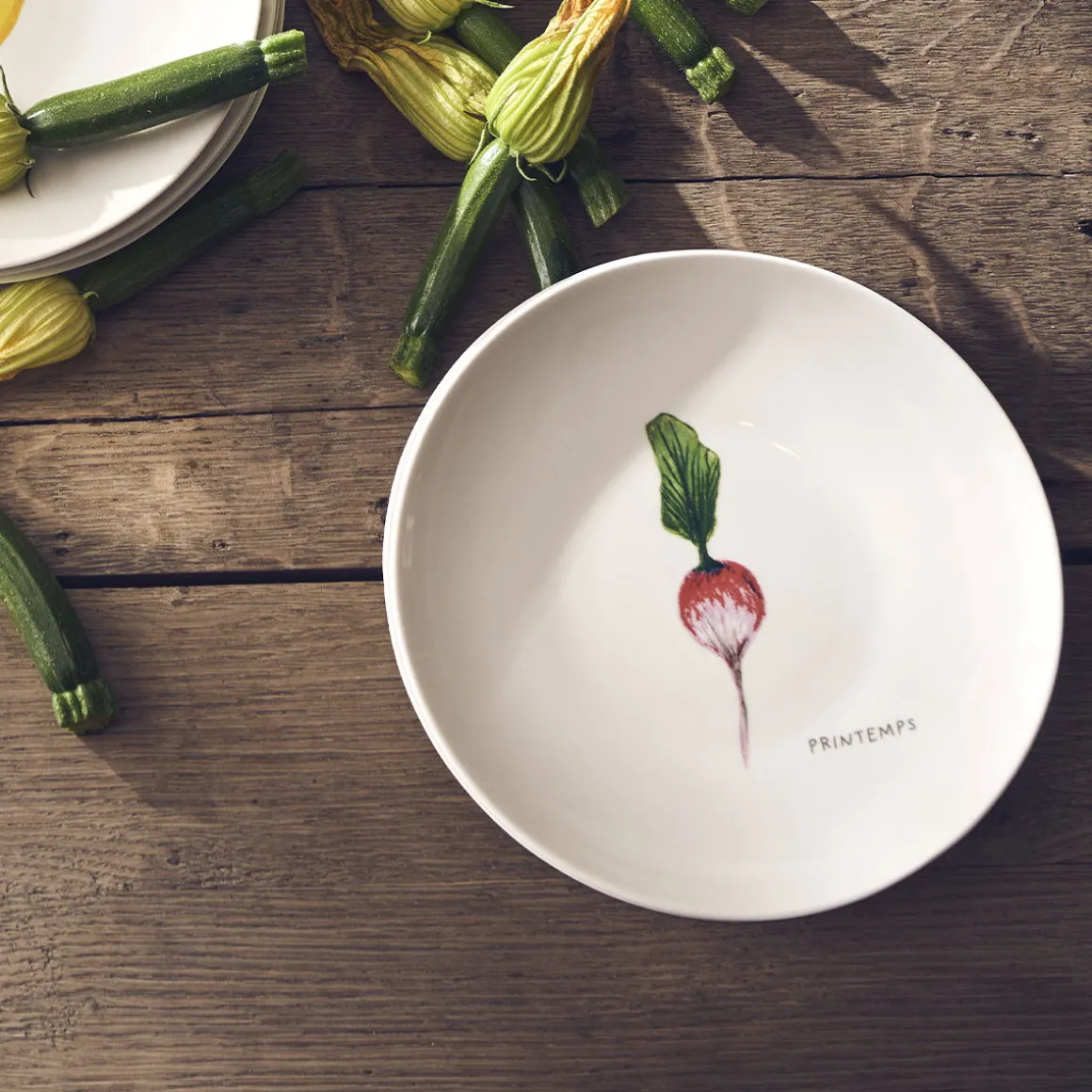 La collection SAISONS est disponible en deux coffrets fruits et légumes de quatre assiettes représentant chacune une saison. Ici le coffret présente nos légumes favoris avec le radis printanier, la tomate qui nous rafraichit en été, le potiron automnal et enfin le brocoli de l’hiver. Tous ces fruits et légumes ont été dessinés à la main au sein même de notre studio de design. Chaque coup de crayon de couleur se révèle alors sur la porcelaine et donne à cette collection un supplément d’âme indéniable. Grâce à une forme légèrement creuse, les assiettes SAISONS se prêtent particulièrement à toutes les tables axées sur le partage.