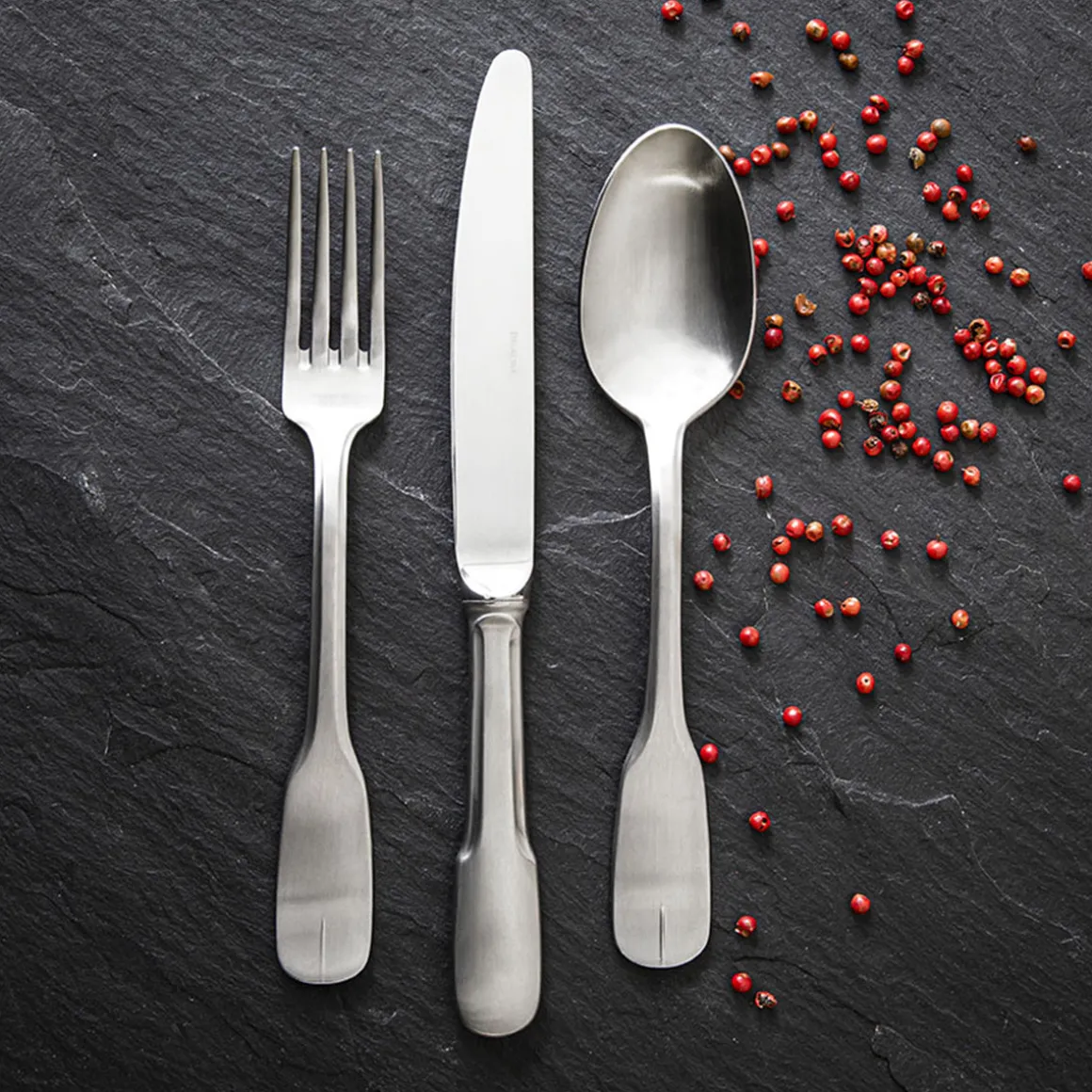 Les couverts VIEUX PARIS SATINÉ de DEGRENNE possèdent une forme traditionnelle qui renvoie à l’atmosphère chaleureuse des bistrots et brasseries françaises. Leur finition satinée se patine avec le temps et en fait un couvert classique idéal au quotidien. Les couteaux existent en manche orfèvre ou en monobloc. Réalisés en acier inoxydable 18%, ces couverts sont faciles d’entretien.
